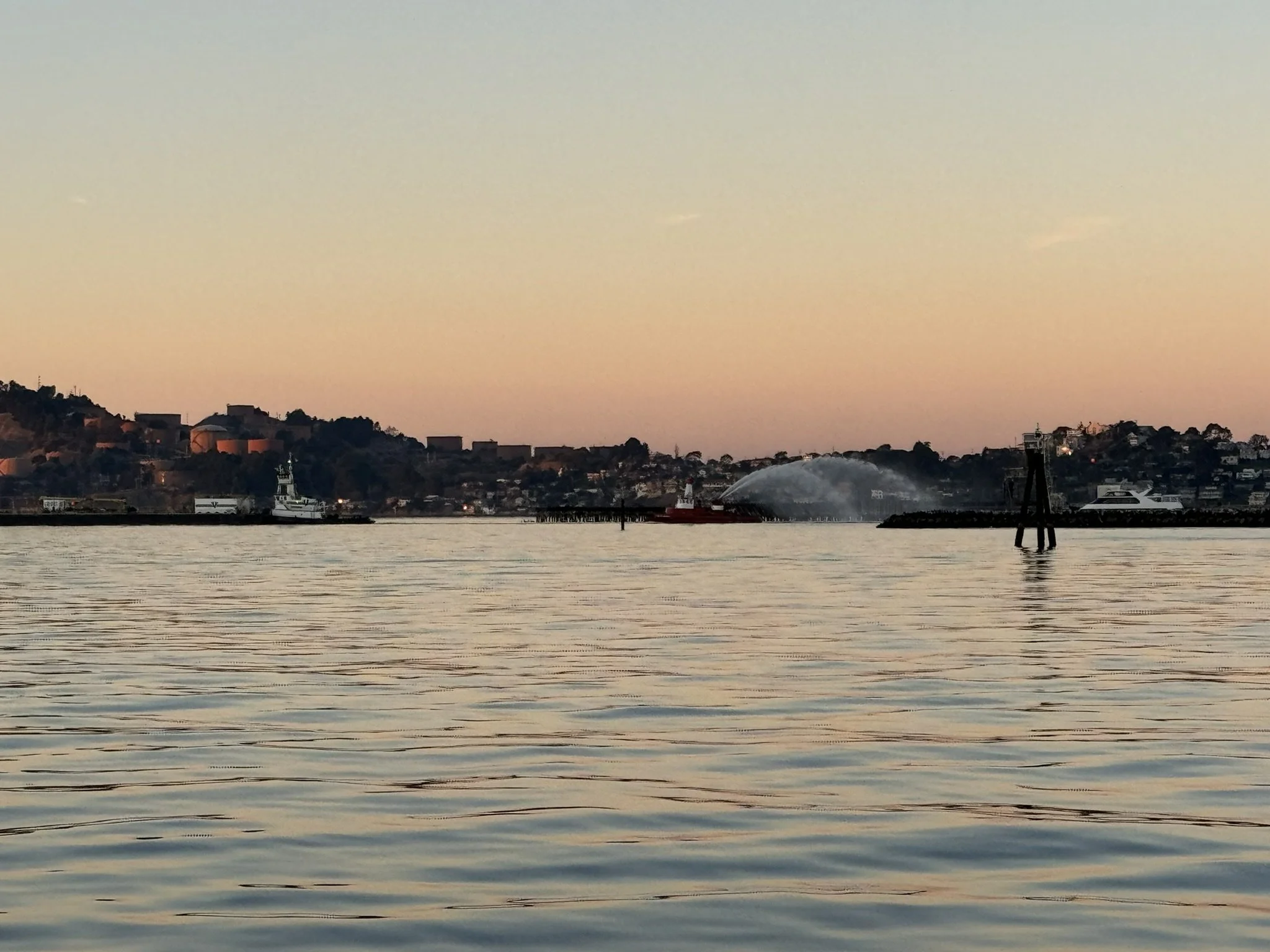 I made it back to the channel entrance as the sun went down and the wind completely shut down. I put the auto-tiller on while I took the sails down. With no wind though the auto-tiller got itself all confused and was driving me around in circles. Around this time a ferry went by too so the boat was rolling around in the wake from that. I did look and the Richmond fire boat was out doing some sort of display with their hoses. I guess they must have got the notice that I had just solo sailed. After taking a quick picture of them going by, I got the sails down, got the motor started and set off into the marina. I ran around the boat getting my dock lines and fenders ready while trying to keep the boat on a reasonable course. Made it back to the marina, lined up on the slip I had been assigned, shut off the motor and smoothly glided into the slip, stepped off the boat and secured my dock lines. It was almost magical and I felt pretty good about myself. I had just solo sailed my boat safely on SF bay.
